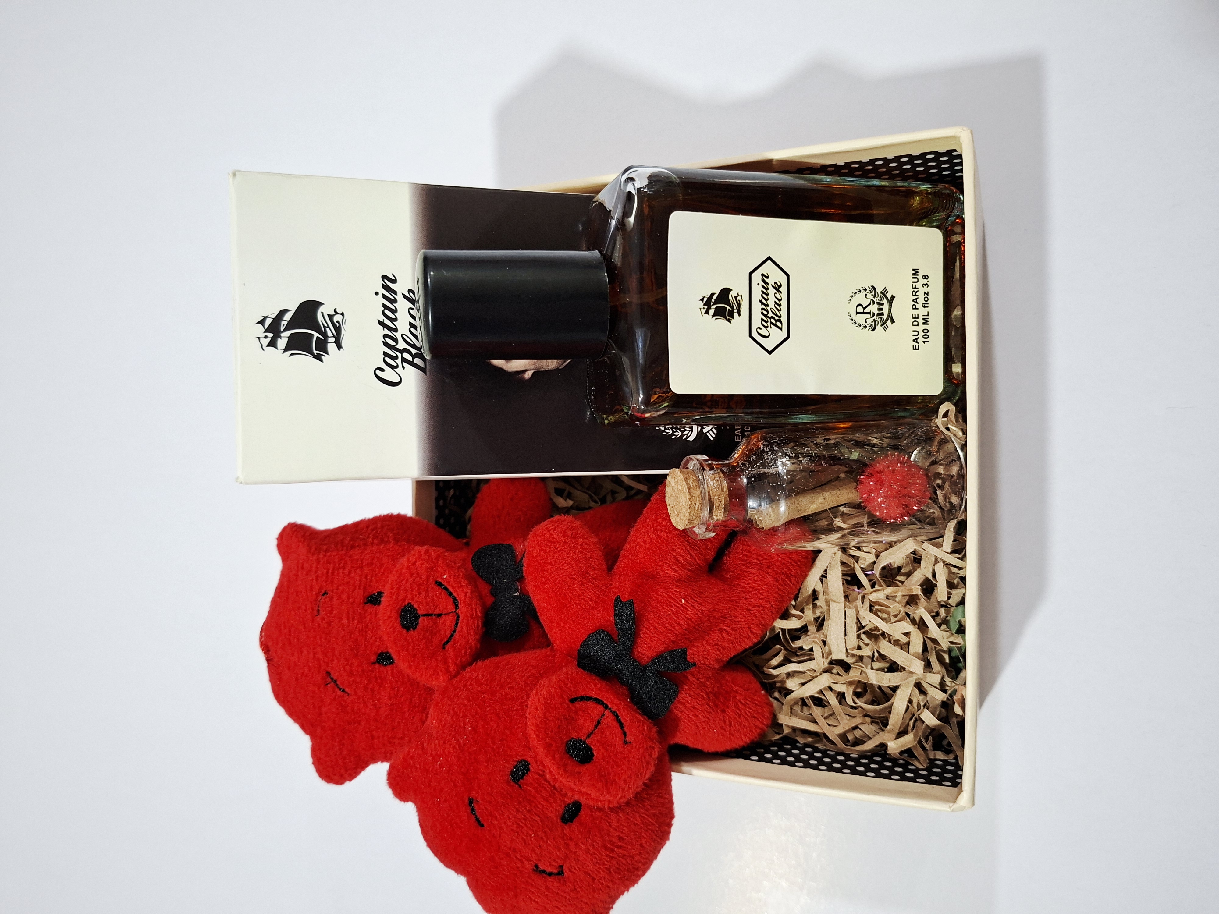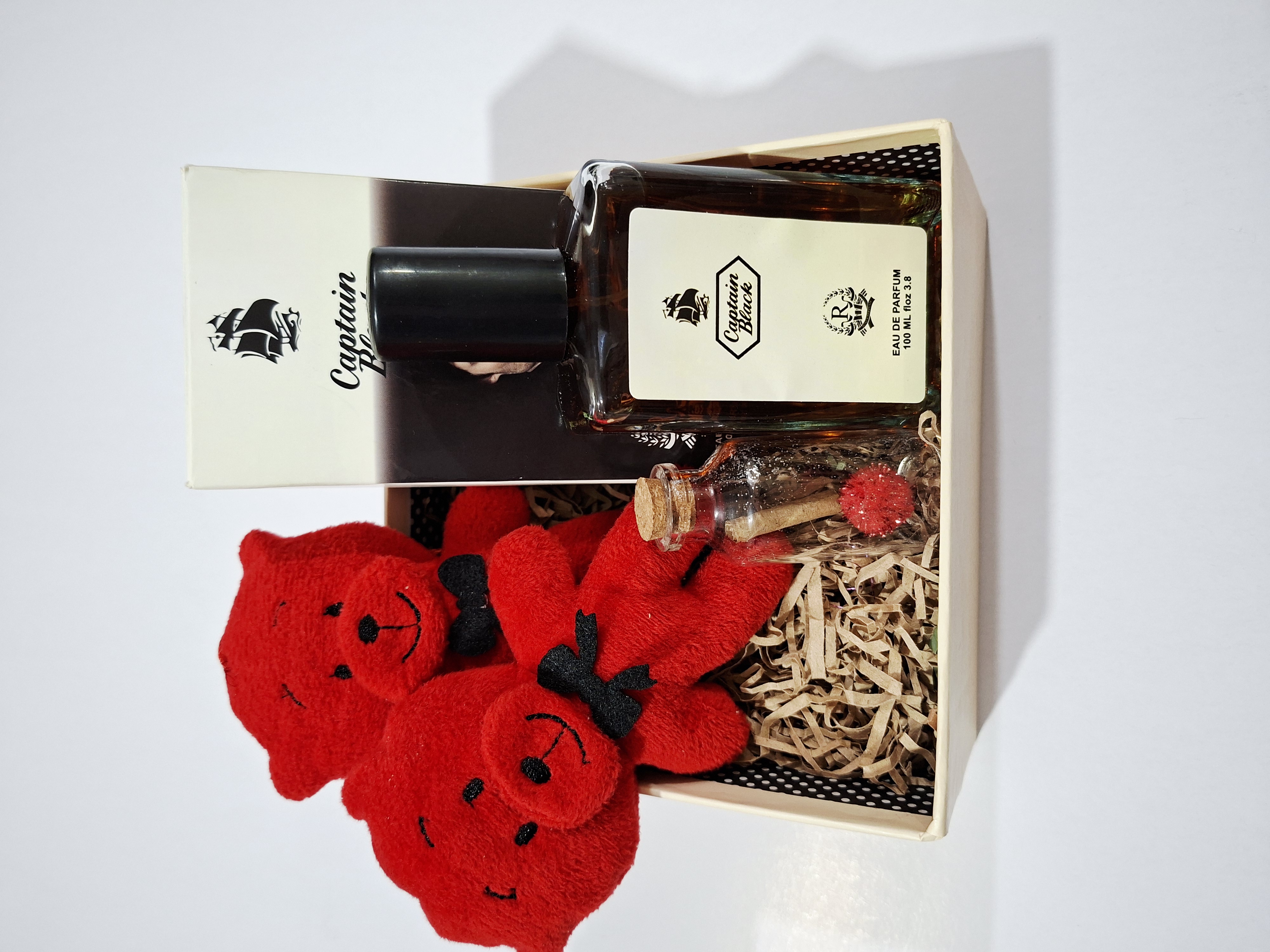 شامل ادکلن ۱۰۰میل کاپیتان بلک، ۲عدد عروسک خرسی، شیشه عشق، پوشال و جعبه کادو