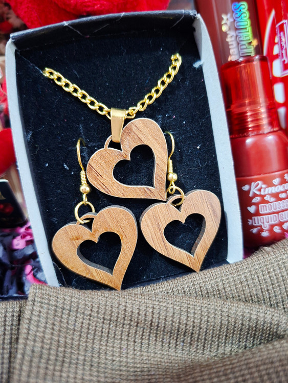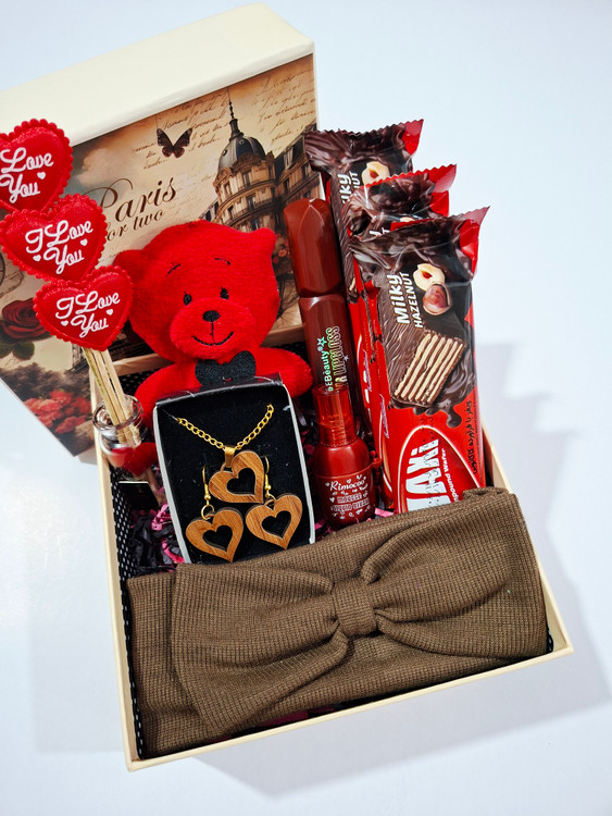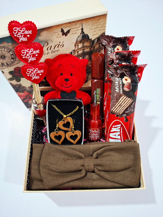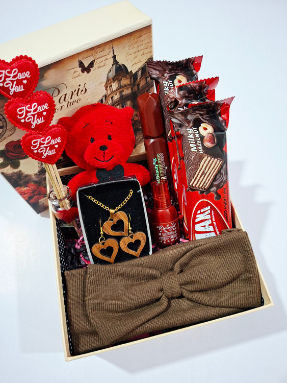 شامل هدبند کبریتی پاپیونی، شکلات کاکائویی ۳عدد، رژلب مایع ۲۴ساعته کیس بیوتی، یک عدد عروسک خرسی، نیم ست گردنبند و گوشواره قلبی چوبی با جعبه، رژگونه رژلب آویز دار ریموکو، شیشه عشق، پوشال و جعبه کادو