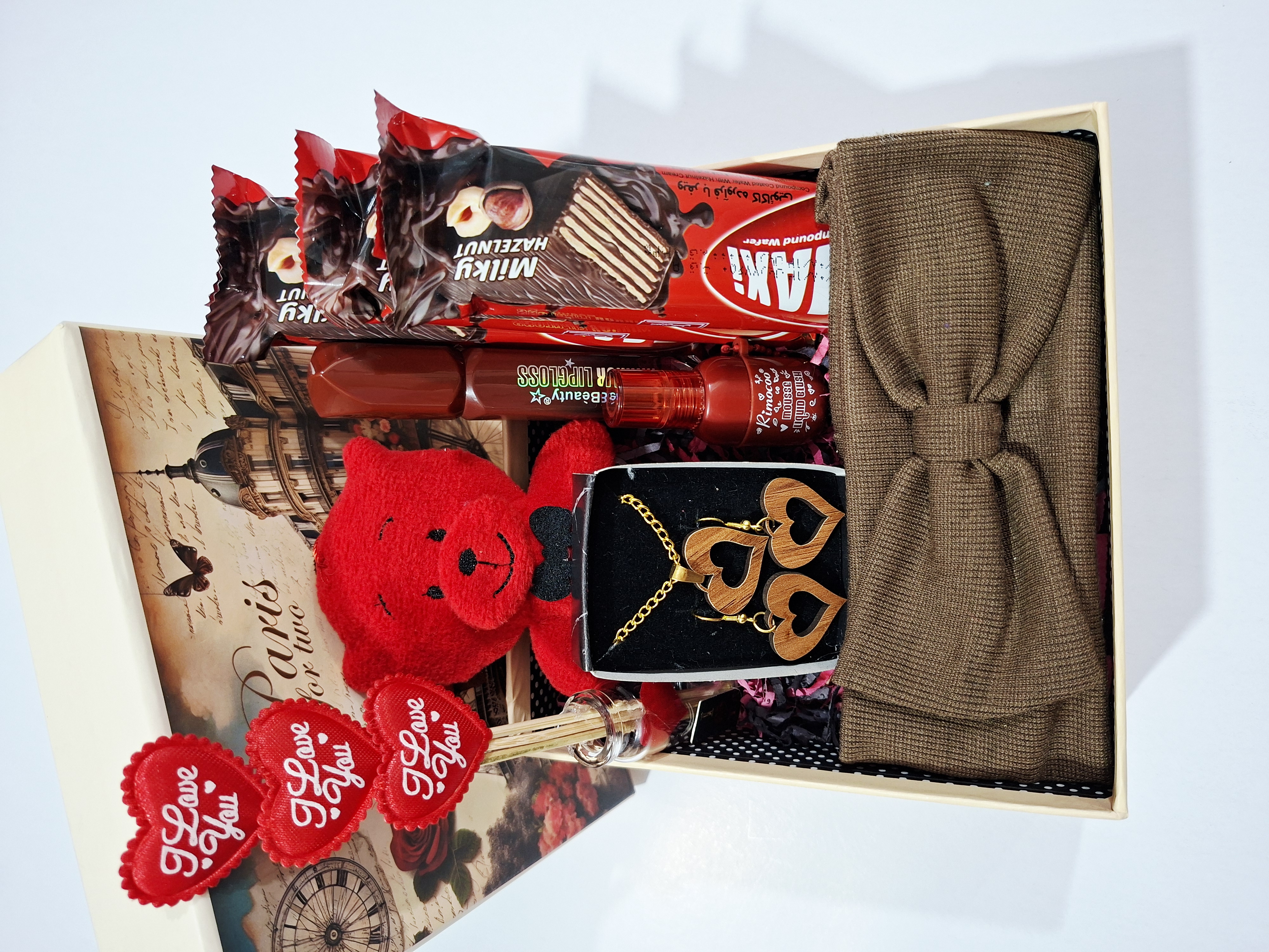 شامل هدبند کبریتی پاپیونی، شکلات کاکائویی ۳عدد، رژلب مایع ۲۴ساعته کیس بیوتی، یک عدد عروسک خرسی، نیم ست گردنبند و گوشواره قلبی چوبی با جعبه، رژگونه رژلب آویز دار ریموکو، شیشه عشق، پوشال و جعبه کادو