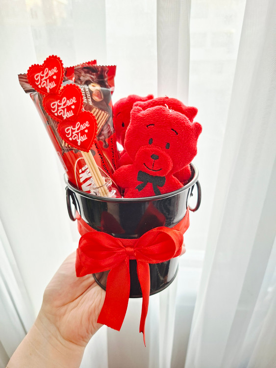 ۳تا شکلات کاکائویی داره بهمراه ۳تا خرس گوگولی و شیشه عشق بهمراه یه سطل فلزی مشکی که تا همیشه کارایی داره و پوشال❤️