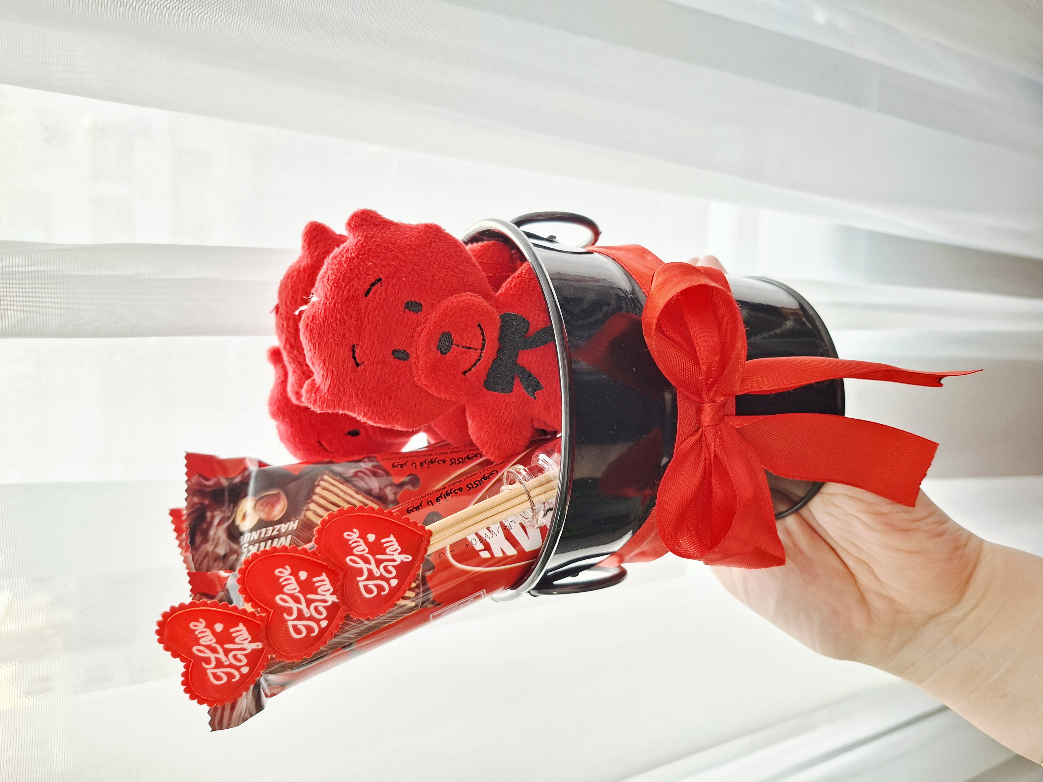 ۳تا شکلات کاکائویی داره بهمراه ۳تا خرس گوگولی و شیشه عشق بهمراه یه سطل فلزی مشکی که تا همیشه کارایی داره و پوشال❤️