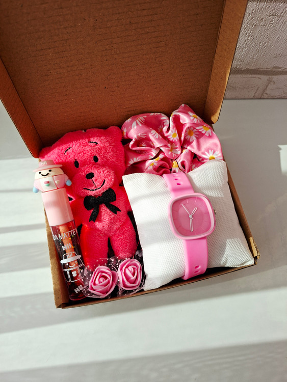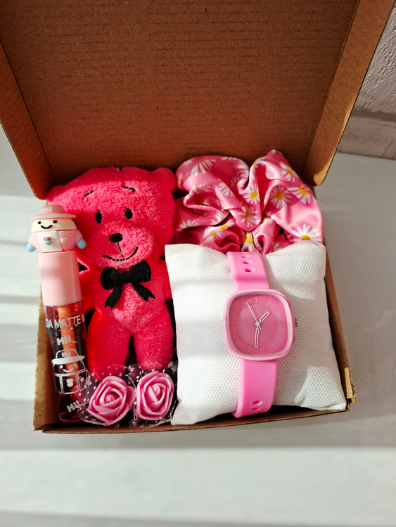 شامل ساعت دخترونه/زنونه بالون بند نرم کیفیت قوی، کش مو ساتن، برق لب عروسکی، عروسک خرسی، دو عدد گل فومی، پوشال و جعبه کادو
