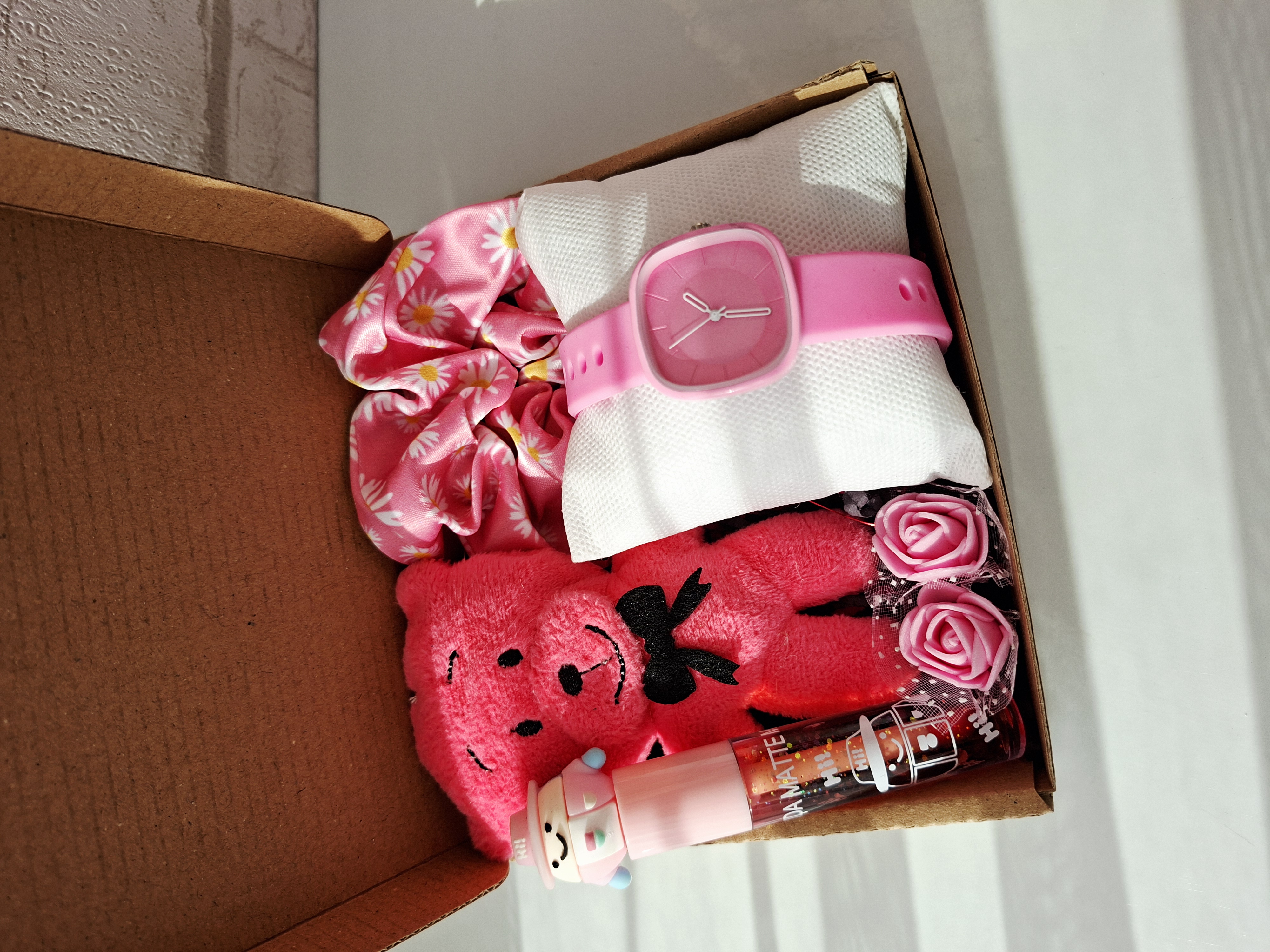 شامل ساعت دخترونه/زنونه بالون بند نرم کیفیت قوی، کش مو ساتن، برق لب عروسکی، عروسک خرسی، دو عدد گل فومی، پوشال و جعبه کادو